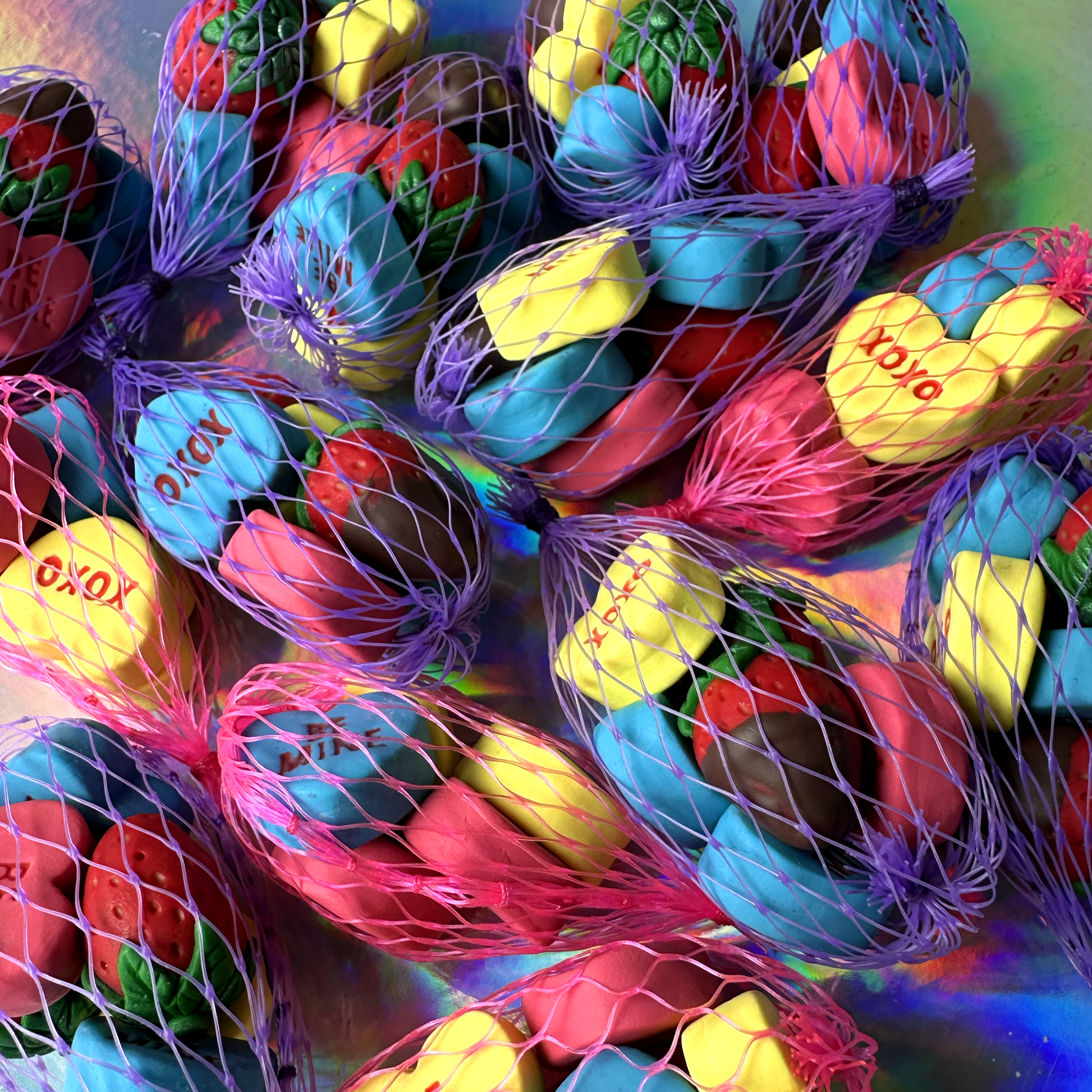 the most festive bag charm, perfect for valentine's day! filled with a mix of 6 handmade polymer clay strawberries, chocolate dipped strawbs, and coloured conversation heart candies, all contained in a purple hand stitched recycled mesh bag.
